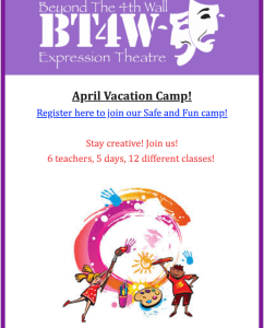 What: 12 half hour sessions that happen on the half hour. Just sign in once and teachers will continuously come into the Zoom space, so no need to re-sign in. Sessions will be a variety of acting, singing, dancing, skit creation and art in true BT4W style.