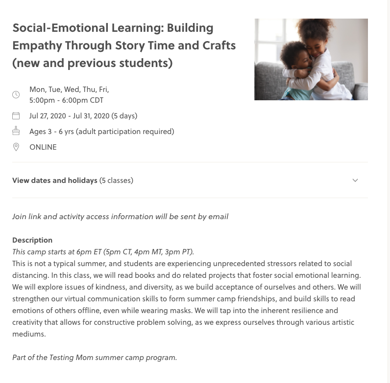 Virtual summer camp with Theater, Creative Writing, Social-Emotional Learning, and Sensory Art! All classes are created and taught by Marcie. Marcie is a guest teacher this summer for Testing Mom, a company co-founded by best selling author and expert on school admissions, Karen Quinn, and New York City’s Gifted and Talented Parent Expert, Michael McCurdy.