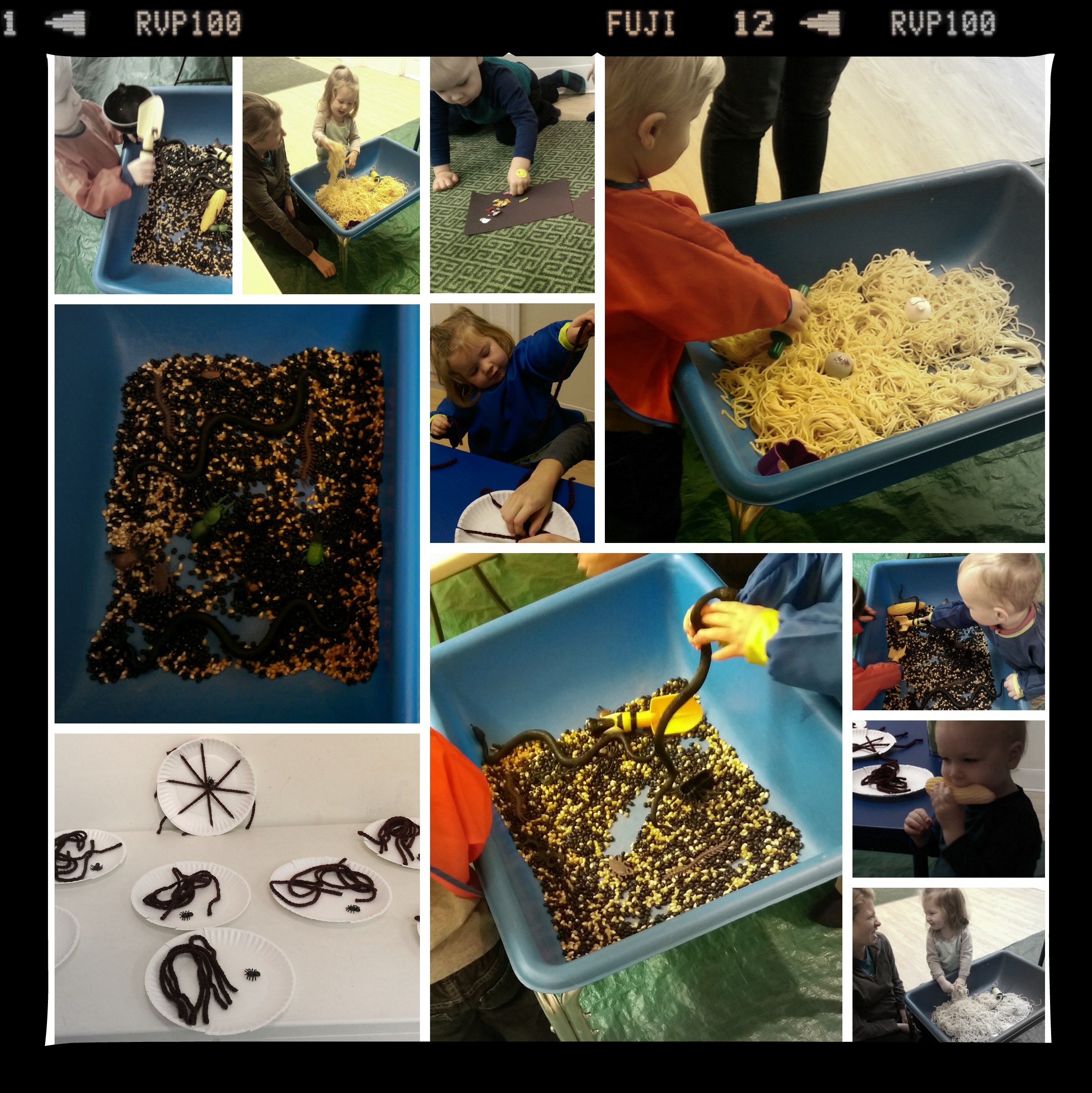 We washed veggies, crafted spaghetti and tried not to sneeze! On Halloween, we had an icky spooky Messy Munchkin Art Class, with bins of bugs and brains. We made spider webs, built a haunted house, and read a funny halloween story.